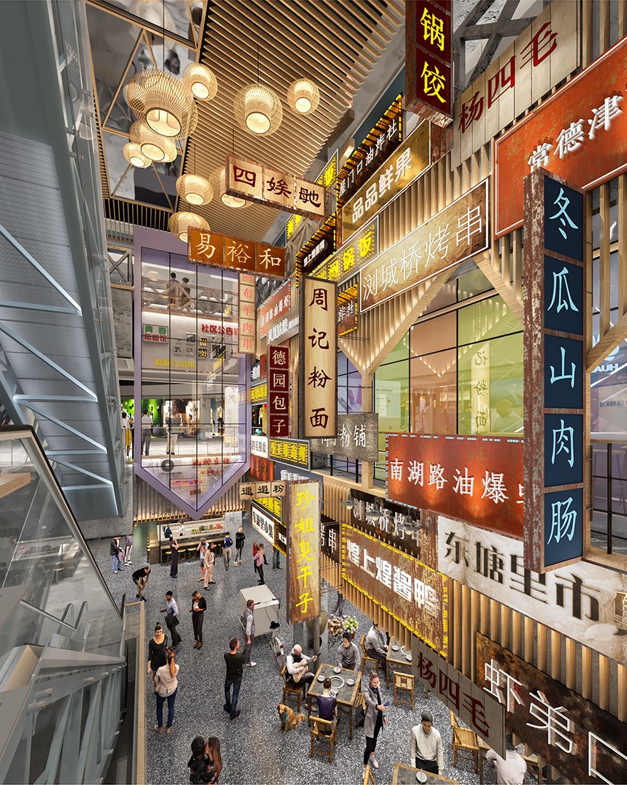 室内空间设计策略——对原有建筑空间进行大刀阔斧的调整,重开中庭,新增扶梯及垂直电梯,有效组织交通,外观突破建筑物原本小面宽,大进深的沉闷空间,把首个柱网空间全部变为开放空间,为原建筑赋予全新可呼吸的灰空间,绚烂的霓虹灯令人痴醉,展现着长沙老街市井生活的热闹景象。绚丽的色彩、本土的建筑语言,以及街巷生活情景的塑造,给与消费者强烈的视觉感受,同时营造浓厚的商业及社交氛围,让消费者如同置身于长沙民俗街巷。