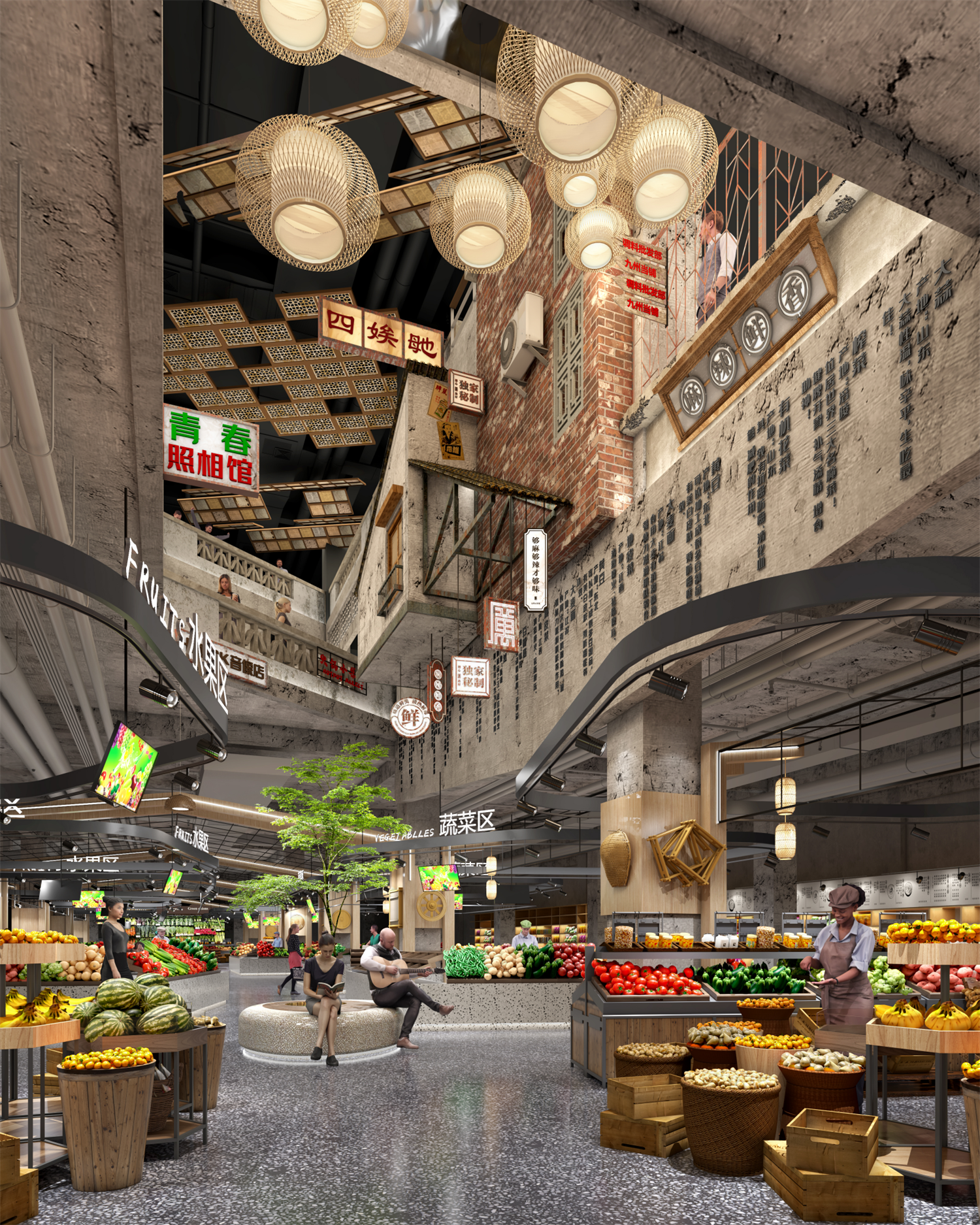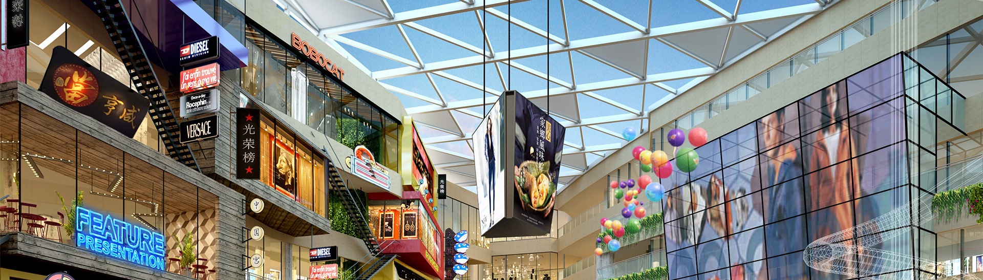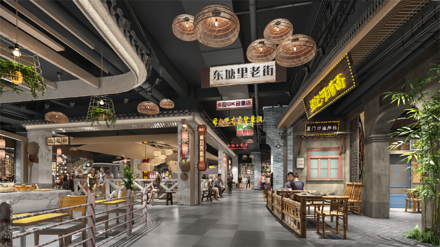 室内空间设计策略——对原有建筑空间进行大刀阔斧的调整,重开中庭,新增扶梯及垂直电梯,有效组织交通,外观突破建筑物原本小面宽,大进深的沉闷空间,把首个柱网空间全部变为开放空间,为原建筑赋予全新可呼吸的灰空间,绚烂的霓虹灯令人痴醉,展现着长沙老街市井生活的热闹景象。绚丽的色彩、本土的建筑语言,以及街巷生活情景的塑造,给与消费者强烈的视觉感受,同时营造浓厚的商业及社交氛围,让消费者如同置身于长沙民俗街巷。